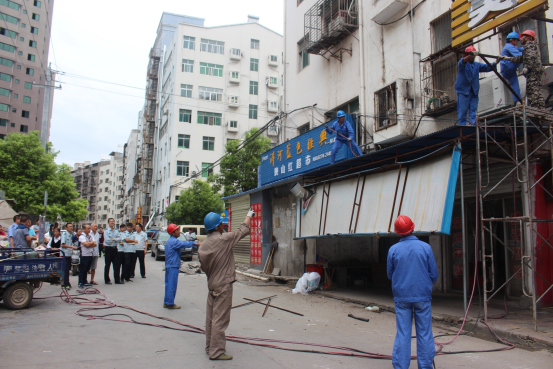 连日来,名泉社区沿渠路进行综合整治。掇刀石街道城管执法中队对名泉社区沿渠路上85处违规设置遮阳棚、雨棚进行拆除,规范店招店牌。区食品药品监督管理局对路段个体经营店开展专项整治,规范业主经营行为。另外,掇刀供电、电信、移动、联通等部门对杂乱无章的线路进行规范。