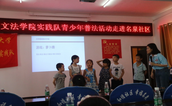 大学生志愿者们根据调查了解到的名泉社区相关法律需求,依托名泉社区“希望家园”针对青少年开展法律游戏、法治情景剧等青少年普法活动,针对社区居民开展法律咨询、法治调研,针对社区矛盾纠纷调解员、网格员等法律工作者开展深入访谈,调研十八大以来基层法治新变化,并为名泉社区捐献了30本《青少年普法读物》,为社区居民带来更多的法律实惠,提升社区居民法律意识,助力社区法治建设。