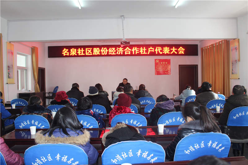1月8日,名泉社区股份经济合作社召开户代表大会,52名户代表参加了此次会议。名泉社区股份经济合作社理事长毛永家向各位户代表介绍了合作社近段时期工作情况,公布了以家庭为单位参加合作社家庭户60户,股东成员184人。讨论名泉社区股份经济合作社预留地合伙开发的意向,到会股东用举手表决同意将土地开发中的费用、袁圣海同志的工资纳入合作社2018年费用开支的预算,最后向全体股东颁发了股权证。并请各位股东监督合作社日常工作,共同努力将合作社经济发展壮大。