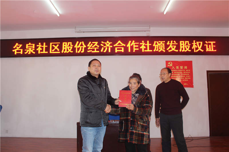 名泉社区股份经济合作社理事长毛永家颁发股权证