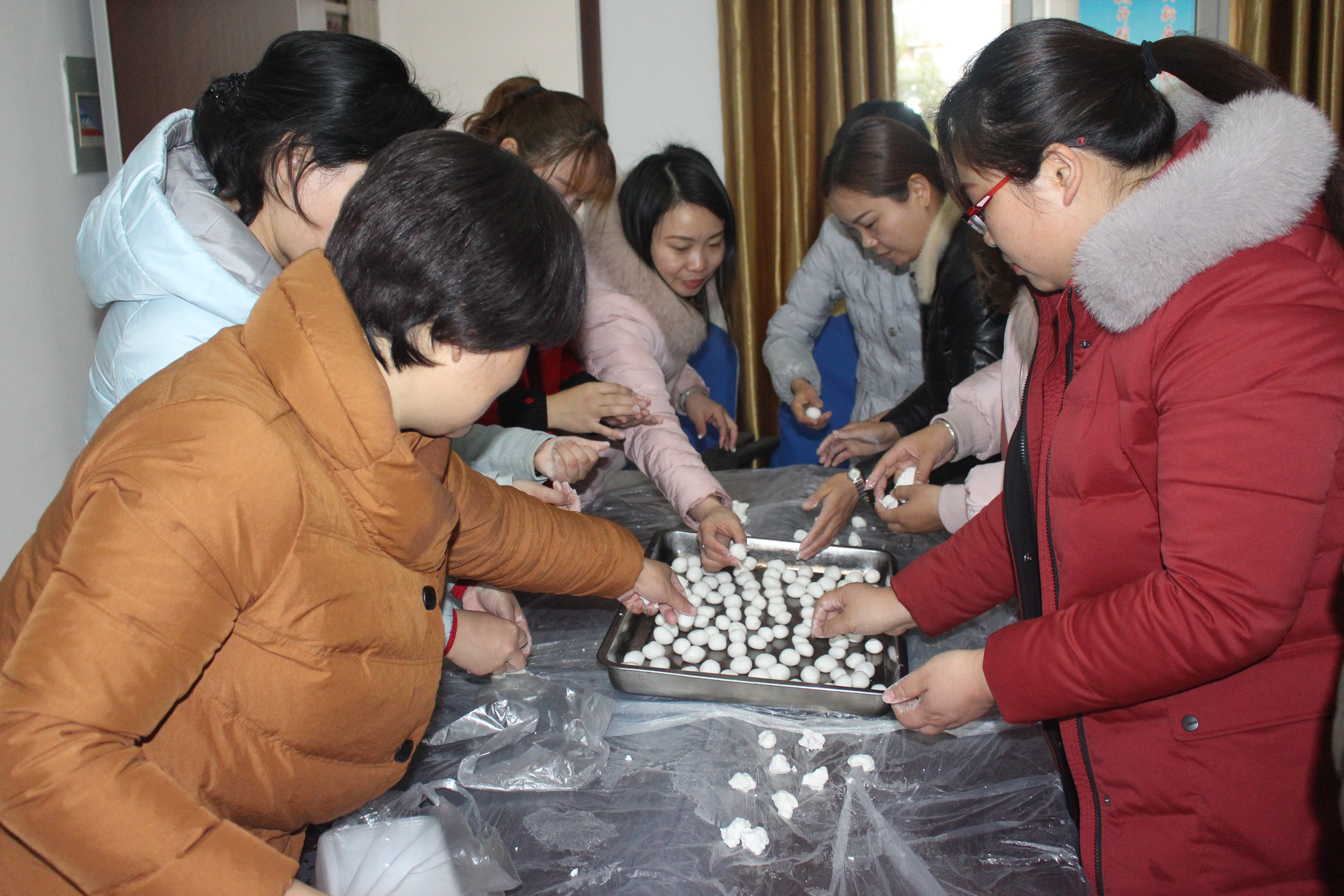 为了让辖区的独居、空巢、高龄老人过一个圆满的元宵节,名泉社区妇女联合委员会的委员们聚集在社区活动室,大家一起动手搓汤圆,将汤圆面取下一小块,放在手心,双手合在一起,均匀的打着圆圈,一个个雪白的汤圆就成型了。大家一边搓汤圆,一边聊着有关元宵节的习俗,半个小时,在大家的共同努力下共包了200余个汤圆。汤圆搓好后,加上米酒放入锅中,不一会儿一锅热腾腾的酒酿汤圆煮好了,满屋子都弥漫着香甜的味道。大家赶紧用打包盒装起来,趁热送到老人们的家中,让老人们品尝甜甜的汤圆。