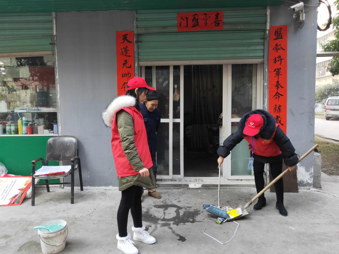 卫生打扫完毕后,志愿者们帮助老人贴上精心准备的春联,让老人倍感浓浓的年味。