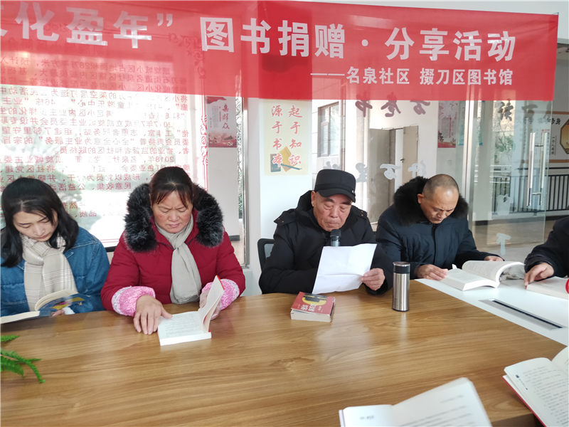 当天,荆门高新区·掇刀区图书馆向名泉社区九源书吧捐赠了一批图书。图书馆负责人表示,后期他们将根据社区实际情况、居民阅读习惯捐赠更多的图书,同时希望以社区文化工作为载体,引导更多的居民会读书、读好书,用阅读汲取精神食粮,提升居民文化素养。随后,凯旋城小区居民蔡邵文分享了他的读后感:“书是窗户,从这里翻越高山,飞越大海,可以洞悉整个世界……”。蔡邵文还认为一个人爱书,可以影响一个家庭一个家族,在他的家族微信群中,每日赏析一句话,一段美文已成为习惯,同时他希望小区居民与他一起爱上美文,爱上阅读。名泉社区工作人员许晓媛说,阅读是在用心灵唱歌,是倾听远离尘嚣的美丽回音。名泉社区分管青少年工作的田娇枝说,书籍是引导青少年成长的坐标。