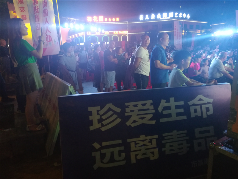 活动前,志愿者为现场观众面对面讲解禁毒知识,发送宣传资料300余份。晚会现场,社区利用宣传标语和通过歌舞、情景剧等形式向广大居民传播“禁毒”知识,期间穿插禁毒知识有奖问答,大家踊跃参加、积极回答,将演出推向高潮。此次活动提高群众参加创建文明城和禁毒工作热情,增强社区文化氛围。