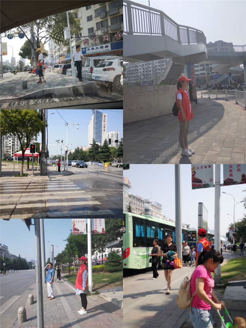 室外温度高达35度以上,社区文明劝导志愿者坚守岗位,引导市民注意自己的一言一行,从文明交通做起。