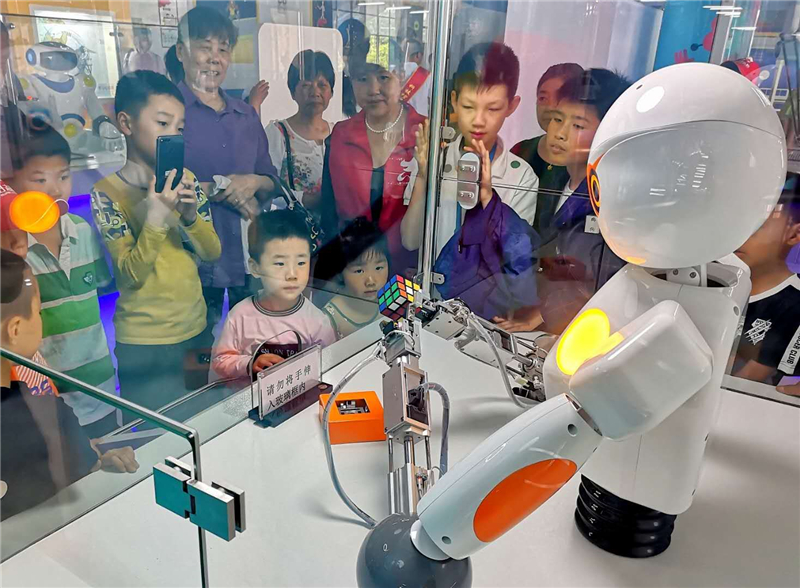 进入机器人乐园,首先接待大家的是迎宾机器人,“她”先向大家问好,然后有条不紊的和大家互动,接着机器人钢琴家用灵巧的手指,弹出悠扬悦耳的琴声,滋润大家的心田,机器人书法家画了兰花,惟妙惟肖,孩子们不由自主的伸出了大拇指。在机器人乐园里,还有舞剑与转陀螺机器人、画像机器人、下棋机器人、解魔方机器人、高数分球机器人等,它们琴棋书画,样样皆通!