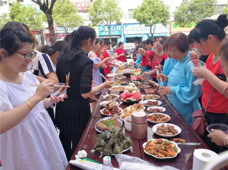 6月6日上午,在端午节来临之际,名泉社区举办主题为“品百味·传粽情”端午百家宴活动,辖区居民150余人带着亲手做的精美佳肴,载歌载舞欢聚一堂共庆端午。