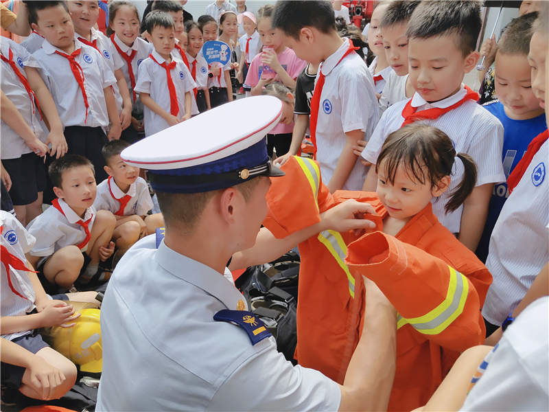 青少年对消防服也十分感兴趣,纷纷尝试穿戴,穿上后大家觉得又重又热,消防员告诉大家,每次执行任务时,穿好消防服加上各种装备,每名战士都要承载60斤的重量,听完,大家对消防员更加钦佩。