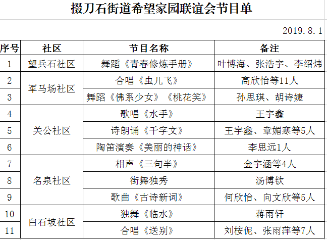 8月1日上午,掇刀区2019年“希望家园”汇报演出在名泉社区顺利举行,团区委书记李虎、团区委副书记文竹、街道党委宣传委员罗涔等参加活动,来自名泉、望兵石、关公、白石坡、军马场等5个社区的100余名志愿者、留守儿童为大家表演了歌曲《古诗新词》、舞蹈《青春修炼手册》、陶笛演奏《美丽的神话》、独舞《临水》等11个生动有趣的节目。