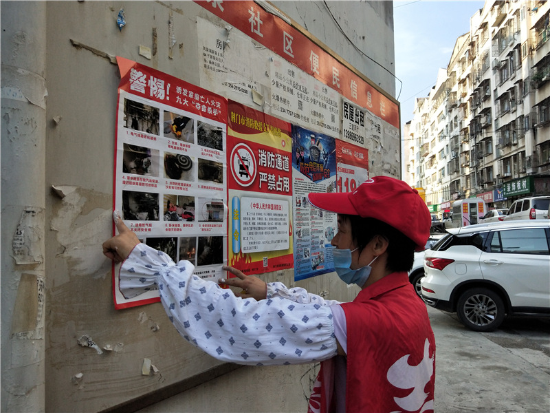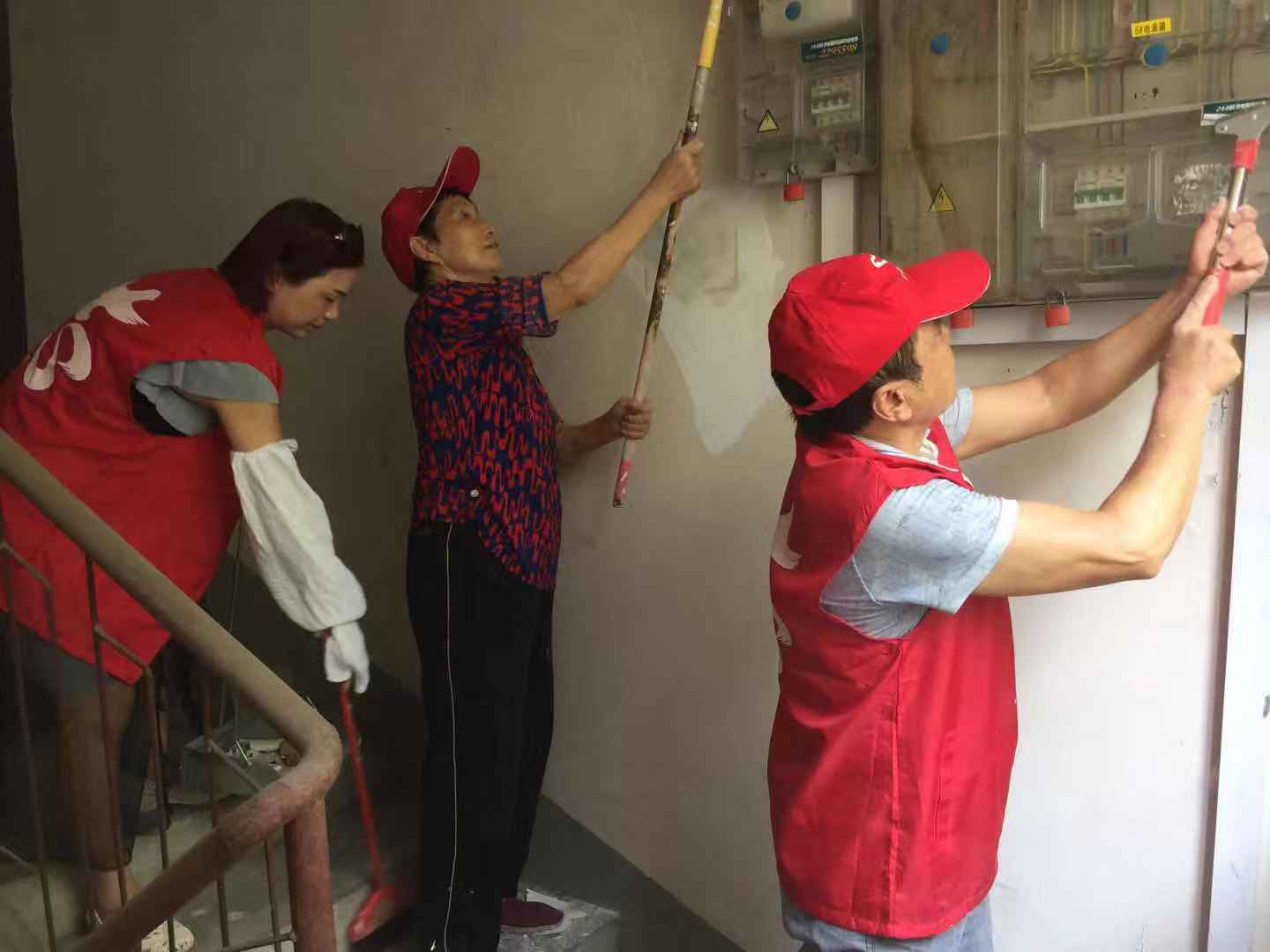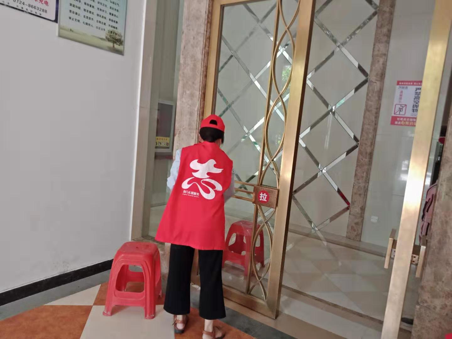 凯旋湾物业组织志愿者对楼栋门进行清洗,清除小广告