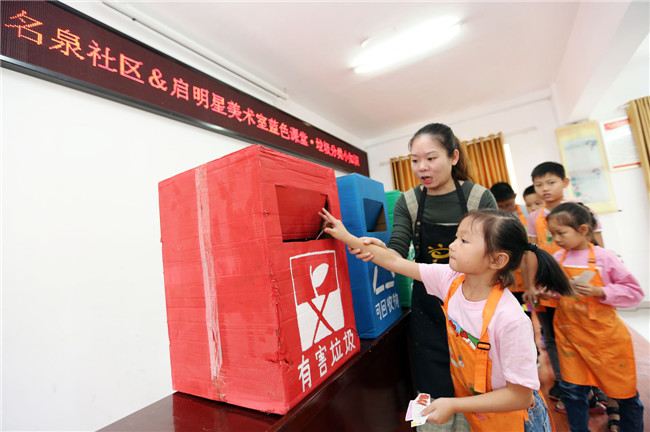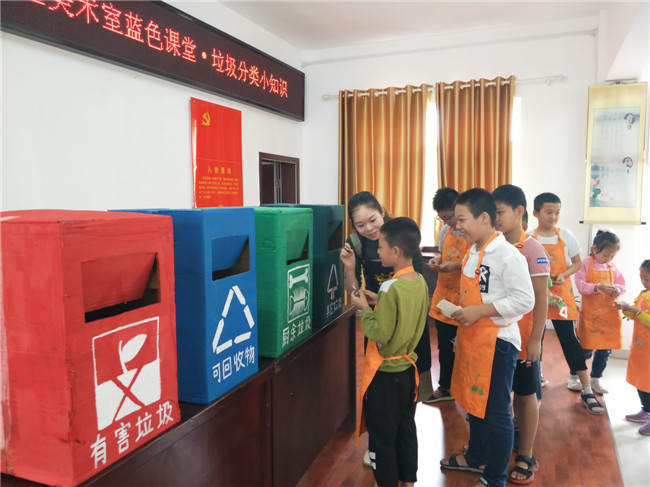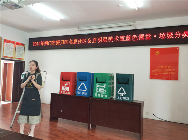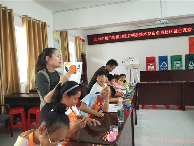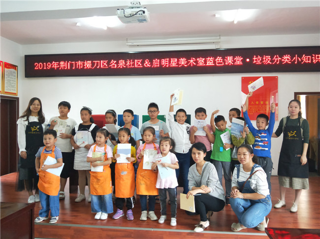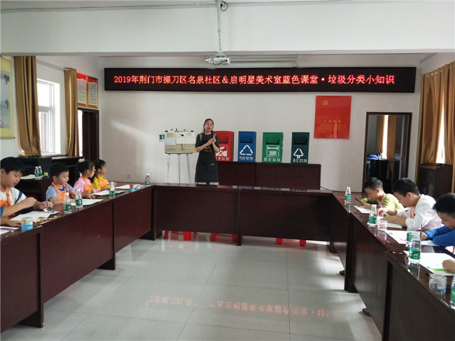 9月15日,名泉社区一爱心美术室(启明星美术室)的老师来到社区市民教育基地,为20余名青少年带来一节垃圾分类知识为主题的蓝色课堂。