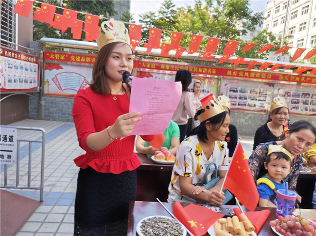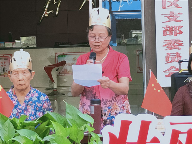 首先进行的是诗歌朗诵,90后居民丁刘萍朗诵了《我骄傲,我是中国人》,饱含深情的朗诵赢得现场寿星阵阵掌声。