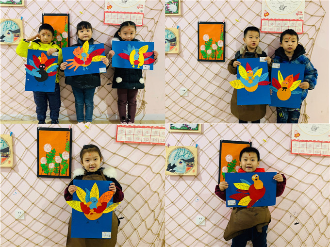 这次活动的孩子们学习的是《漂亮的火鸡》这幅画,作画时依然用到了色卡纸、黑色勾线笔等。整个作画过程,能够培养幼儿对美术活动的兴趣,锻炼幼儿手眼协调的能力,养成有条理的操作习惯。活动中,童梦之家画室的刘老师首先让孩子们参考了各种各样火鸡的照片,引导孩子们自己去描述火鸡的形态特征,羽毛的颜色等,这样就让孩子们对火鸡有了一个直观的认识和兴趣。孩子们拿到绘画工具后,一个个认真投入到“创作”中去,按照自己的兴趣爱好,自己的理解,用不同颜色的卡纸,剪出不同形状的火鸡尾巴,接着老师再引导孩子们把五颜六色的尾巴拼在一起,组成一个绚丽多彩的大尾巴,最后在配上身子,神气十足的火鸡就完成了。