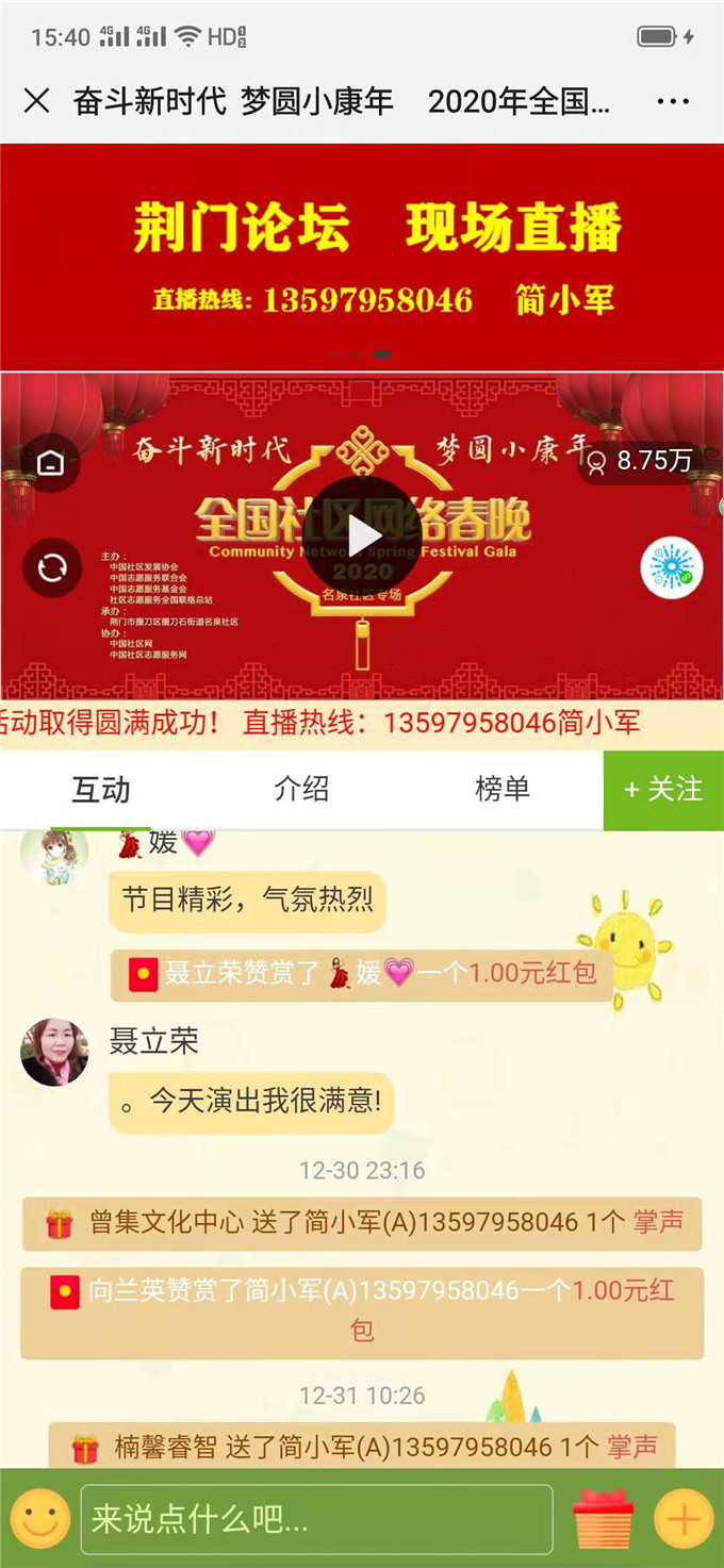 通过全国社区网络春晚这个大舞台,践行了社区“家”服务理念,不仅丰富了居民文化生活,更是让社区和居民更近、更亲。名泉社区已连续三年参与了晚会录制,旨在通过本次晚会让更多的人看到荆门人民的风采。