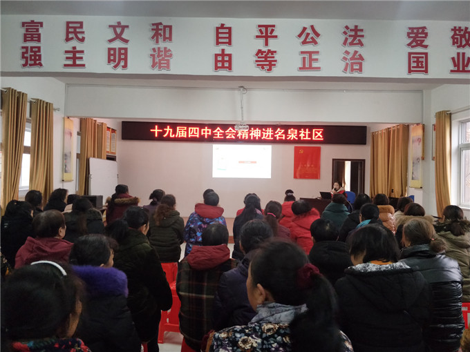 随着十九届四中全会的胜利召开,名泉社区组织工作人员观看学习,邀请省理论宣讲员进社区宣讲十九届四中全会精神,为居民送上新鲜的精神食材。