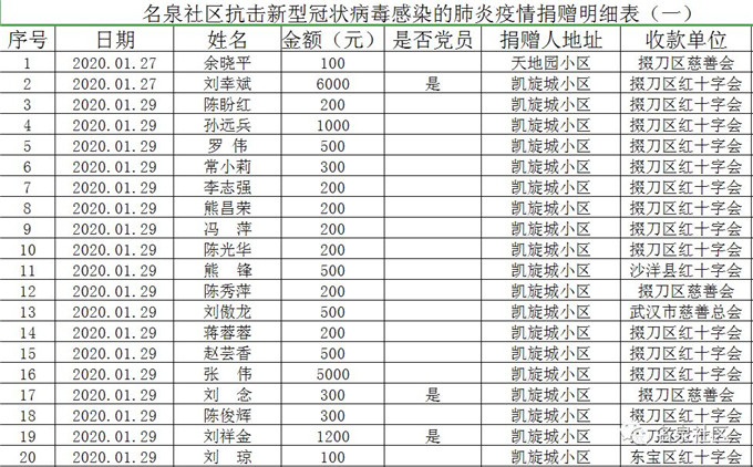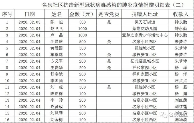 “疫情无情,人有情”,在名泉社区“大家庭”里,大家都自发为防控疫情捐献自己的一份力量。截止今日,名泉社区党员、居居,已累积捐款36380元。