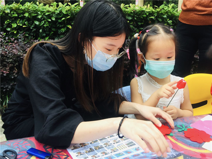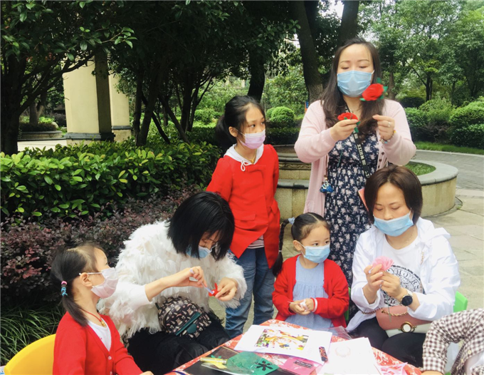 活动开始前,卢老师给大家发放了手工材料包,小朋友们兴致勃勃的地拿着手中代表着祝福的红色、粉色等各种颜色的仿真花材料跃跃欲试。活动中,卢老师从如何套花瓣、调整花瓣形状等方面一步一步做了详细介绍。很多孩子和有些家长性子比较急,刚开始时没掌握诀窍,显得没有耐心。卢老师说到:“做手工花是一项培养人的耐心的活动,大家慢慢来,不着急。一旦摸到窍门,学起来一点也不难。”在老师认真细致的指导下,大家手持打火机不断热熔胶棒,从绕花瓣、贴叶片、包装花束,一步一步制作的十分认真,很快一朵朵含苞怒放、鲜艳欲滴的花朵盛开在大家的手中了。孩子们拿着自己制作的作品,相互比较、交流经验,脸上满是喜悦和成就感。