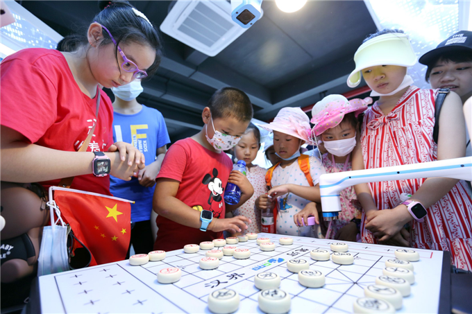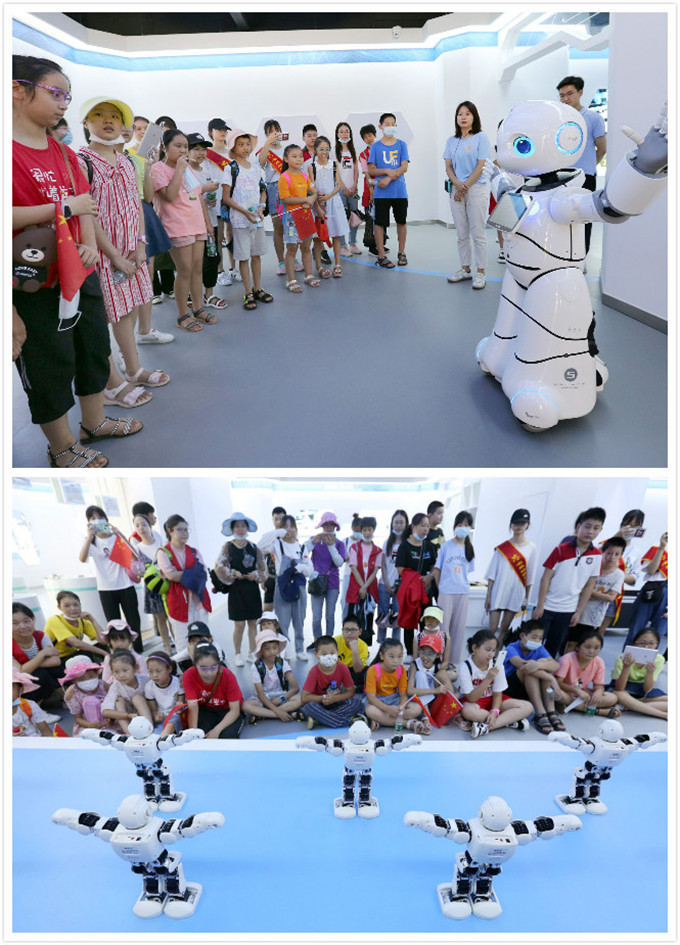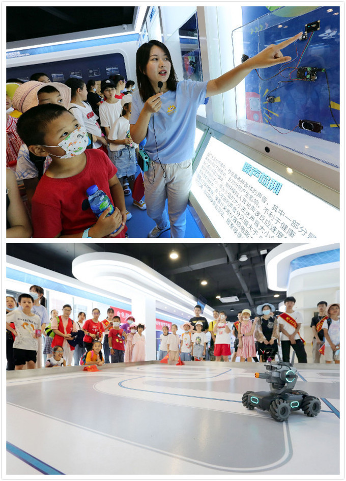 第二站青少年走进金色阳光创客工场参观体验,科普实验墙、智能展示墙、机器人的发展史,让青少年了解科技对生活带来的影响。勇者征途对战赛、机甲大师障碍赛、机器人舞蹈秀、航模表演等,将青少年们带入奇幻世界,一览智能机器人的风采。