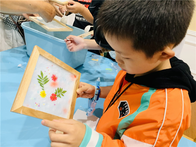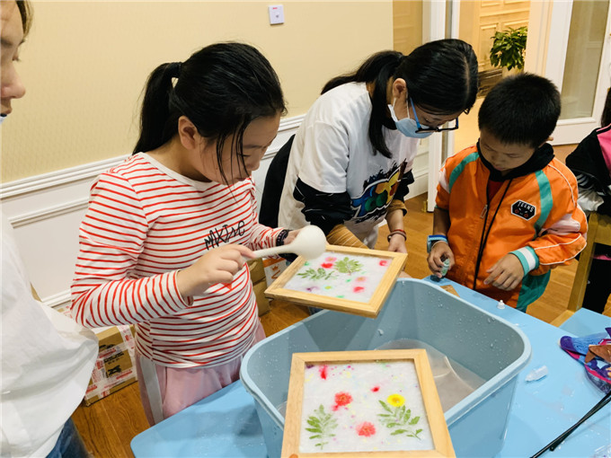 做纸最关键的一步——用纸帘让纸成型,将混合好的纸浆均匀地倒在方形的纸帘上形成白纸的雏形。但是,普通的白纸太过于单调,老师们又准备了各式各样的花瓣与叶子,让大家可以在自己做的纸浆上创作一番。有的孩子装扮出美丽的图案,有的孩子则拼出动物和花朵的图案,孩子们充分发挥自己的想象力,制作出一幅幅美丽的花草纸。