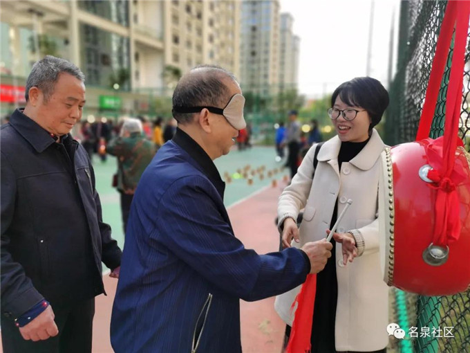 蒙眼击鼓—测试老年朋友的反应能力,原地三圈能精准的敲到鼓,就可获得一枚小印章,活动结束就可获得由海纳佳城小区提供的精美礼品。