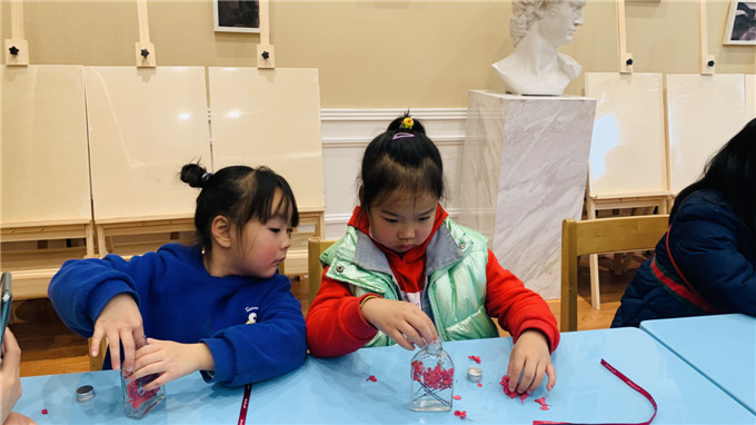 参加此次活动的大小朋友人数较多,但大家围坐在一起氛围很好,井然有序。制作浮游花步骤比较简单,但如何活用不同花色的浮游花,红色、粉色、蓝紫色、黄色……集结彩虹版绚丽的花材,却是很有讲究,虽然只是把花装入玻璃瓶中,但不同的家长和小朋友排列时的秩序与美感,却又显得格外不同。