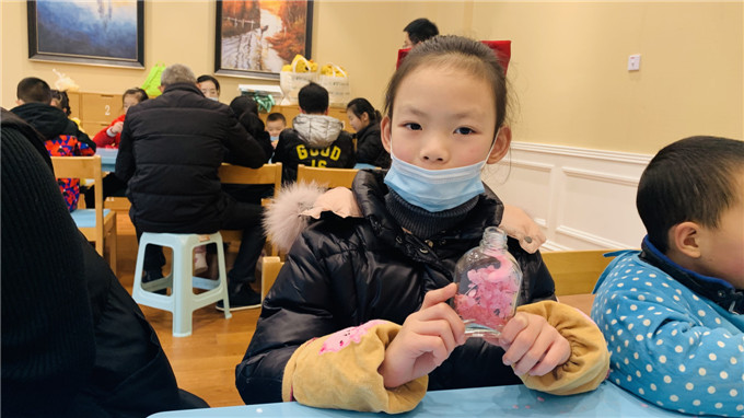 大家听完老师的讲解,一步一步动手制作起来。不一会儿,原本空空如也的玻璃瓶中,就出现了绽放的小世界。就像是开启新的蜡笔或颜料盒的时候一样,活动室瞬间洋溢起了缤纷的色彩,大家的心情也变得如那天的阳光一样晴朗。最后往瓶中倒入浮油,干枯的花枝花瓣便更加的鲜活起来,仿佛充满了生命力。