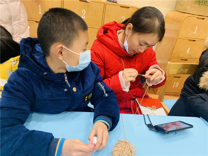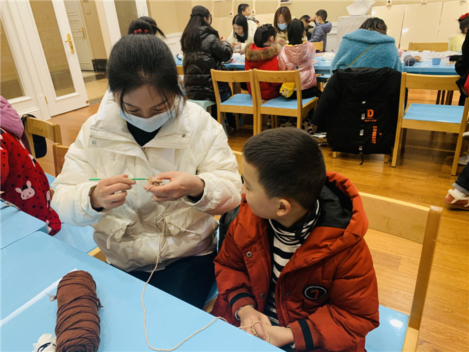 活动现场,在老师的示范与讲解后,小朋友们和家长朋友们摩拳擦掌,跃跃欲试。大家根据图样和视频,按照老师讲解的步骤制作起来,有些家长朋友有编织基础,操作比较熟练,有些家长朋友是零基础的爱好者,现场分小组进行,有基础的老年家长朋友带领青年家长朋友,大家互帮互助,忙得热火朝天。