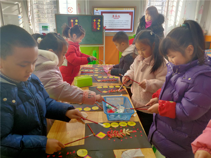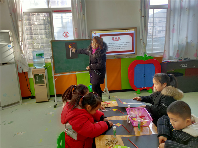 活动中,志愿者为孩子们讲解贴春联、放鞭炮、年夜饭、拜年等春节习俗,让孩子们了解中华民族传统节日。志愿者为孩子们准备纸片、吸管和花生壳等材料,接下来便是做手工的时间,孩子们跟着志愿者用贴、画、拓印的形式来亲手创意制作手工鞭炮贺卡,来表现春节放鞭炮时的热闹情景。