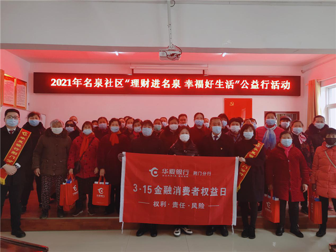 3月19日,名泉社区第四网格党小组联合华夏银行荆门分行开展主题为“理财进名泉 幸福好生活”公益行活动,社区50余名居民聆听了专家讲座。
