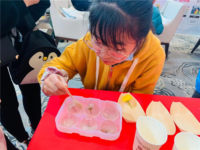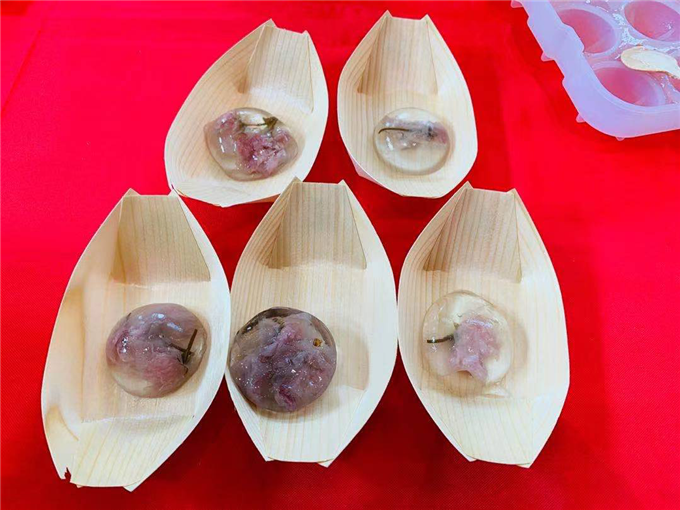 樱花水信玄饼的制作材料主要有:白凉粉、盐渍樱花、模具、红糖。一大早,家长就带着孩子们来到了我们的活动现场,上述材料早已经为大家准备好。其中使用的盐渍樱花就是取自于花期盛开时的重瓣樱花,樱花摘下后采用盐渍的方法进行保存。樱花水信玄饼的制作步骤主要有以下四步:第一,将盐渍樱花放置于温水中反复进行数次冲泡以去除盐味和苦味。第二,白凉粉与少量冷水混合并搅拌均匀后,倒入沸水中煮至再次沸腾,即可出锅。第三,将樱花与凉粉倒入模具中等待冷却成型。第四,将红糖放入锅中加入少量水煮至融化。最后,将凝固成型的樱花水信玄饼沾着红糖汁,就可直接食用。