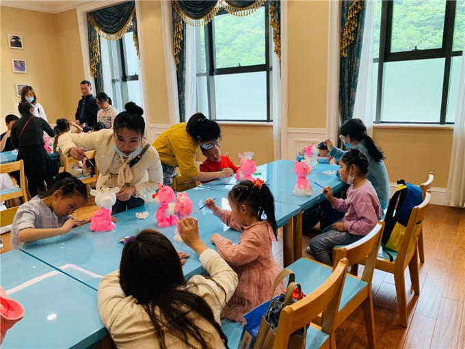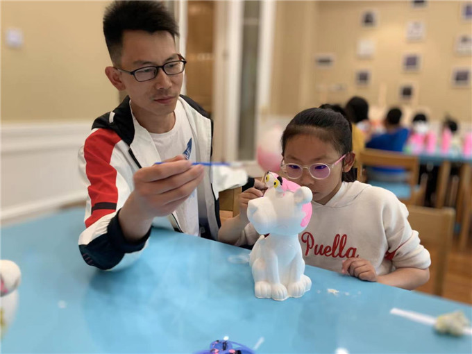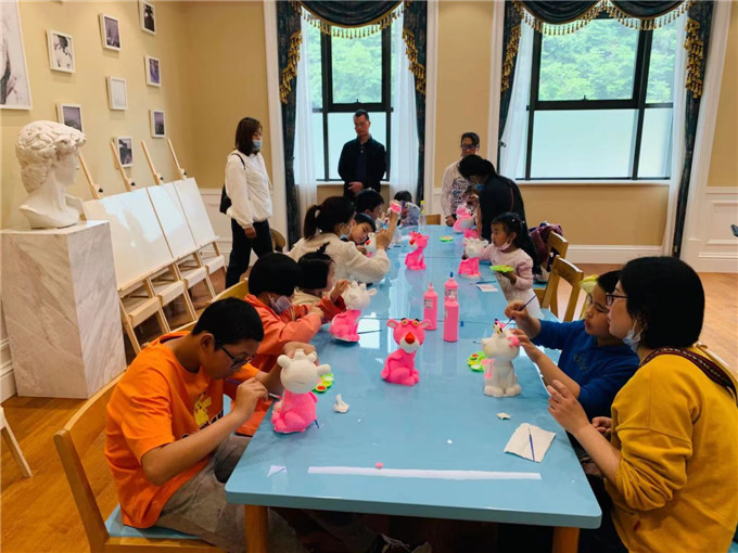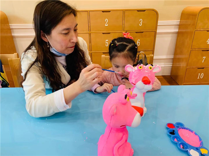 5月4日下午,参加活动的家长和孩子们在卢老师的带领下,乘坐专车早早的来到了活动现场,而自驾来的家庭就更早了。一进入手工活动室,在场的工作人员就急忙拿出了准备好的粉红豹石膏存钱罐和五颜六色的涂料,因为孩子们个个兴高采烈,已经等不及了嘛。不过动手之前,孩子们还是得安安静静、认认真真的听老师讲解涂鸦技巧和步骤,画错了可对不起手上可爱的小豹子啊!