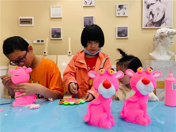 开始涂色了,孩子们手里拿着画笔,迫不及待地在石膏上涂鸦,家长们也像是回到了快乐的孩提时代,拿起画笔来更是异常兴奋。粉色在豹子身上占比最多,拿起最大的画笔,存钱罐慢慢有了粉色的皮毛外衣,接着就是拿起细细的毛笔,精雕细琢了,黄色的眼睛、黝黑的眉毛和胡须,最后还有那突出的红红的鼻子~
