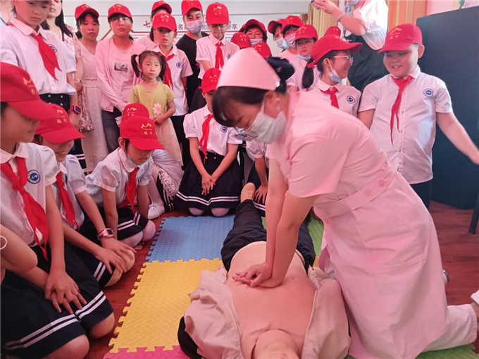 活动中,李艳妮护士从现场救护基本知识、心肺复苏技能及气道异物梗阻现场急救、突发事件和意外伤害的现场应急、救护技能实际操作、创伤救护基本技能(止血、包扎、固定、搬运)、疫情防控等方面对大家进行了理论知识与实际操作技能的培训。给同学们模拟患者突然倒地心跳呼吸停止的现场,耐心细致地讲解心肺复苏过程中的意识及生命体征判断并通过模拟人体进行了演示。然后,在专业护士的指导下,同学们根据李艳妮护士所讲的急救知识,亲自实践操作,给大家演示了心肺复苏、人工呼吸等急救处理方法。