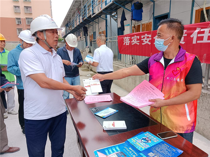 现场,社区普法志愿者结合工地实际,围绕施工现场安全管理责任、施工人员生活区用电用气用火安全、劳动权益保障和反诈骗等方面开展宣讲、接受问询,受到项目负责人及工友们的欢迎。