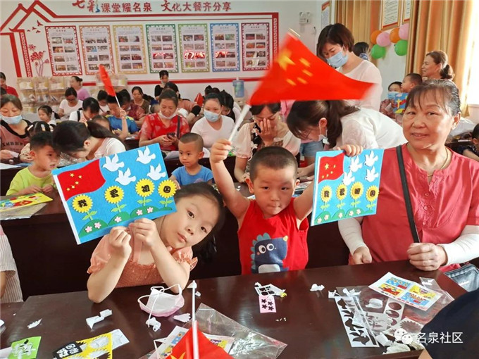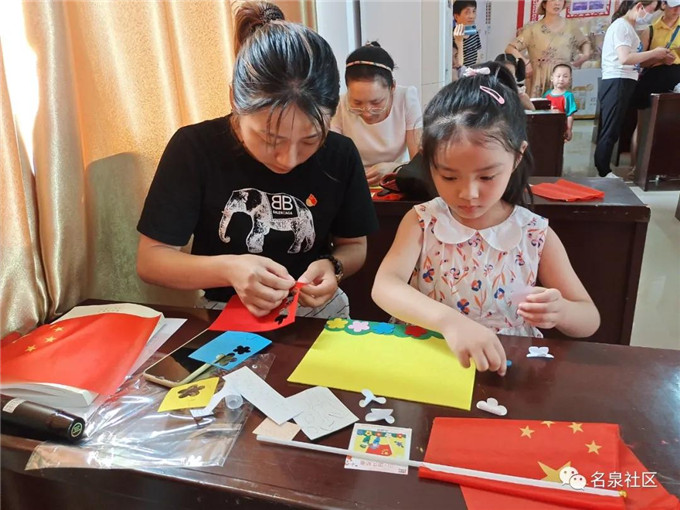7月1日,名泉社区开展“学党史,庆‘七一’”亲子DIY国旗画活动,吸引了辖区30余组亲子家庭参与。