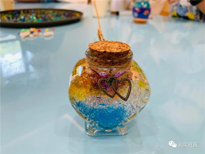 怀揣着对海洋的向往以及对海洋瓶的喜爱,每一个孩子都沉浸在自己动手的乐趣之中。先是精心挑选自己喜欢的瓶子和漂流瓶、贝壳、五色石、花朵、海星等装饰材料,在家长们的帮助下一起同心协力将色彩斑斓的“海洋宝宝”注入晶莹剔透的玻璃瓶中。经过大家的精心制作,各式各样如梦如幻的海洋瓶便呈现在众人面前,仿佛一片片充满着神秘与梦幻的大海,承载着孩子们对未来幸福生活的情感寄托。