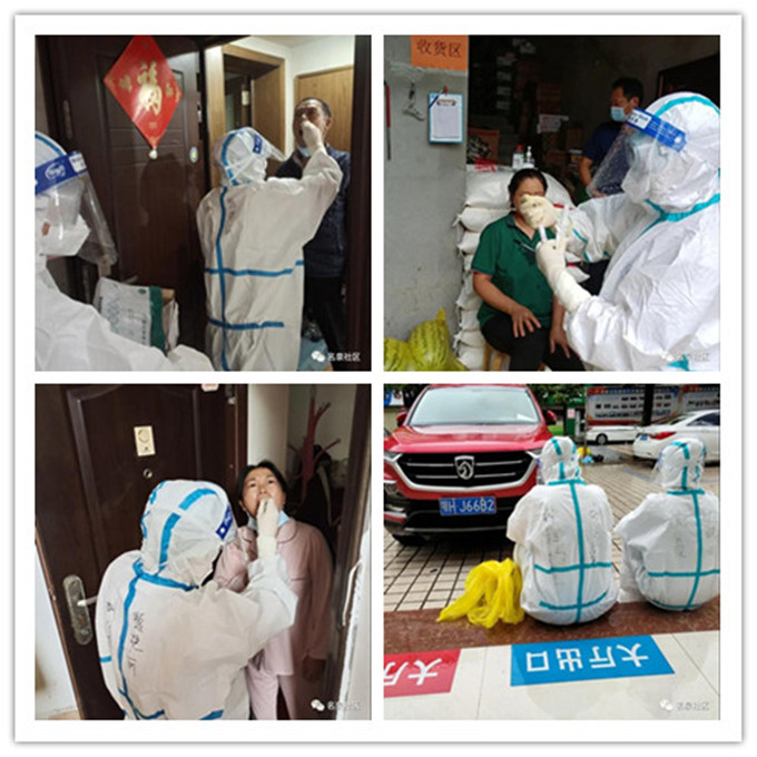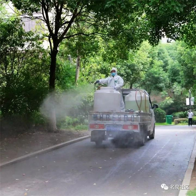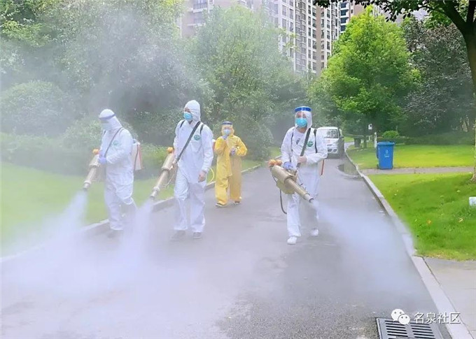 在炎热的天气下,队员们穿着厚厚的防护服,带着护目镜,背着沉重的喷雾器,汗水湿透了衣服,对于小区内所有地面和单元门口做了一次全范围的消杀,不曾漏下一处。