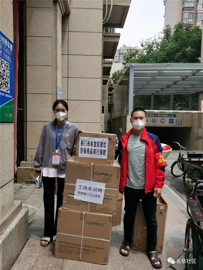 惊闻掇刀各小区严管严控,疫情防控不断升级,凯旋城小区先后排查出多名确诊病例和无症状感染病例,为支援掇刀区疫情防控工作,赵玲玲、丁燕军夫妇向名泉社区凯旋城小区定向捐赠100套防护服、100个护目镜、100双手套以及消毒酒精、消杀喷壶等价值近万元防疫物资,方便驻小区街道、社区防疫人员和物资配送志愿者使用。