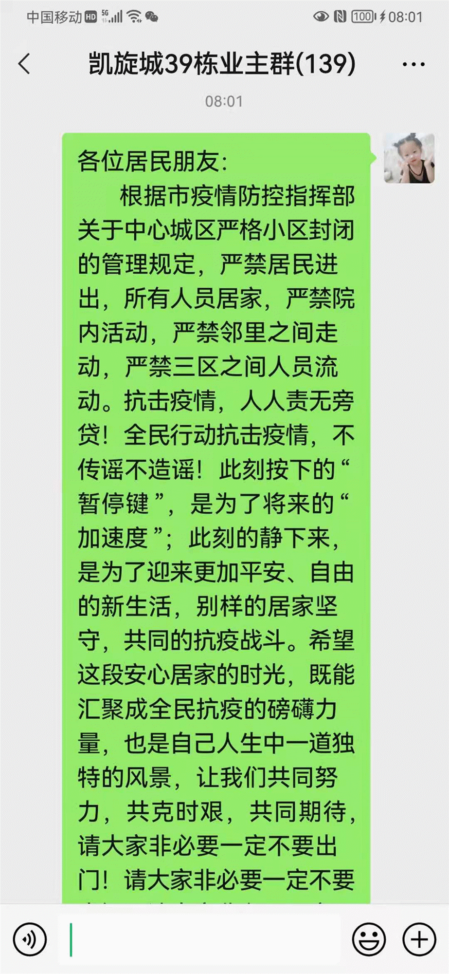 防控“德尔塔”,从来都不是少数人的事情,这是一场事关全民的健康保卫战!对于普通人来说,安心的待在家里,就是对病毒最好的抵御。在凯旋城里,有这样一些人,他们在业主里时刻提醒大家,号召大家在特殊的时期,待在家里,一起防控“德尔塔”。曾经在小区里话家常的邻居们,如今在网络中相互鼓励。加油打气。