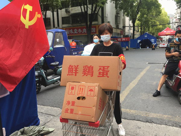 现在志愿者保供小队已经非常成熟了,从商贩手中接过物资,然后送到居民家里。15分钟就能搞定。15分钟的背后,是他们这十几天里的高强度工作,每一个居民的门牌号他们都烂熟于心。