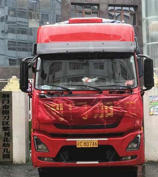 恩施利川向荆门捐赠的蔬菜抵达名泉社区,车头上荆门加油四个大字,是利川兄弟对荆门的关心。志愿者他们默默顶着风雨,搬运着蔬菜。