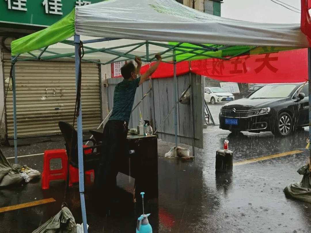 一场大雨,让在卡点值守的志愿者们手足无措。平时使用的遮阳棚无法遮挡大雨,而且大风还随时可能把遮阳棚吹走,造成安全问题。这时候,荆门市军休所的朱正元所长,他在大雨用双手紧抓着着遮阳棚。各个卡口的志愿者们,也都在想着办法应对着这场大雨。不管志愿者前面面临的是什么困难。我们都不会退缩。