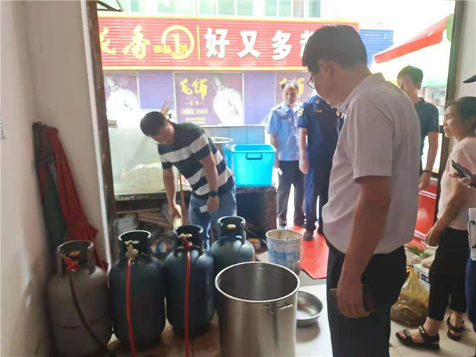 6月18日上午,区燃专委组织各成员单位区公安分局、区消防大队、区市场监管局、区城管局、掇刀石街办、名泉社区等部门,组成联合执法小组对名泉社区名泉路两旁京山汤馆、小庹酒楼、品味堂牛肉面馆等17家餐饮门店进行餐饮行业用气安全联合执法专项排查。对各经营场所液化气钢瓶存储是否合规、使用中的钢瓶是否合格、是否按规定使用燃气器具等方面进行拉网式排查,共清查出过期未检、报废钢瓶16个,排查出液化石油气钢瓶违规存储、使用过期未检钢瓶、灶具连接软管需更换等安全隐患25个,共下达隐患整改通知书14份。