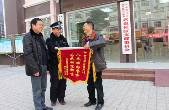 2月6日,掇刀南城明珠业主委员会将一面写着“为民排扰解难,人民的好警察”的锦旗送到了掇刀区掇刀石街道名泉社区警务室,感谢社区民警帮助查明小区空中花园起火的原因。