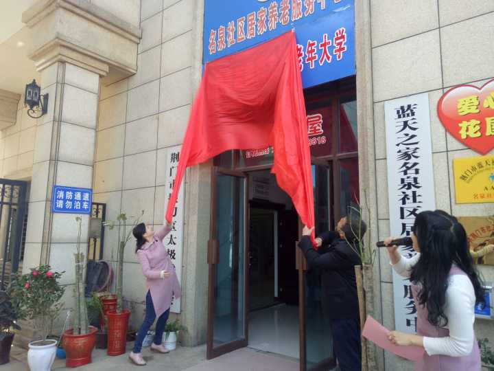 4月9日上午9:00,名泉社区联合蓝天社工开办的名泉社区蓝天之家老年大学在名泉社区居家养老中心门前广场举行了揭牌仪式暨开学典礼,荆门市文明办副调研员王立军、掇刀区民政局社区办主任安静、掇刀石街道组织委员周璇、美好志愿荆门中心负责人赵玉海以及老年大学全体师生共计300余人参加了此次活动。