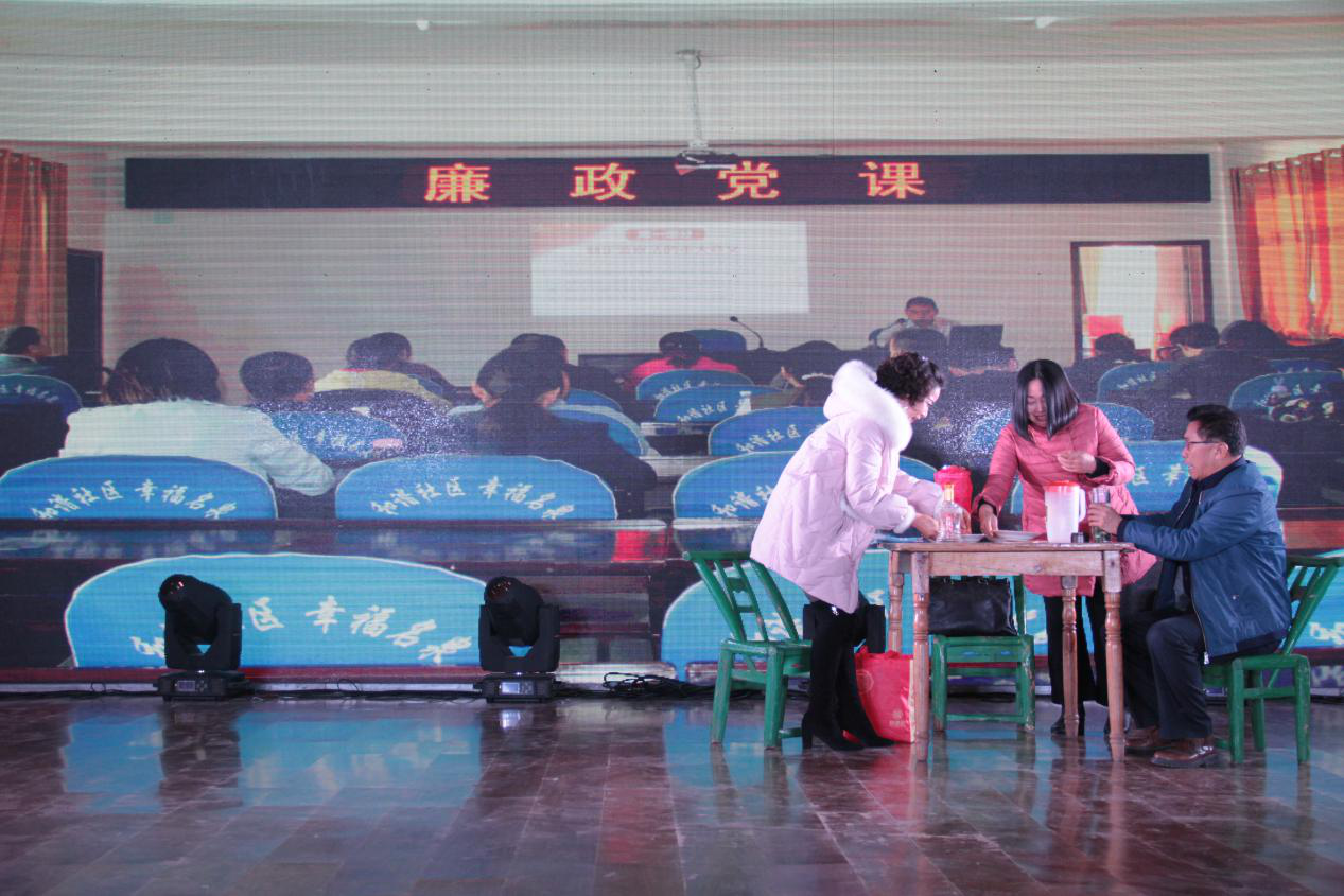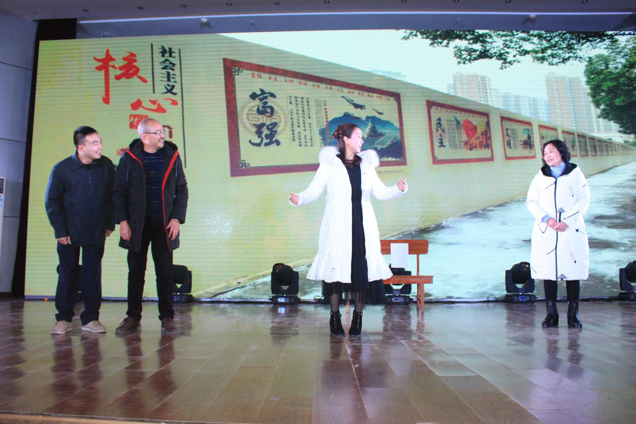 2018年12月30日下午,在区政府会议中心内,名泉社区的居民们自编自演了舞蹈、小品、情景剧、合唱等形式多样的精彩节目,同时在节目中融入文明创建、党风廉政等知识。台上演职人员卖力演出,台下观众鼓舞喝彩,现场热闹非凡。