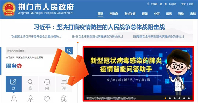 访问网站域名http://www.jingmen.gov.cn,进入荆门市人民政府网站首页,点击新型冠状病毒感染的肺炎疫情智能问答助手幻灯图片,进入疫情智能问答页面。