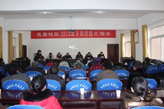 2014年1月7日上午9时,掇刀石街道对名泉社区2013年工作进行考评考核,参会人员有社区居民代表、党员等39人,掇刀石街道办事处党委宣传委员、党政办主任苏小东;街办副主任王玲;综治信访主任沈士诚;街办民政办曾杨:街办经济发展办主任王涛等领导参加会议。