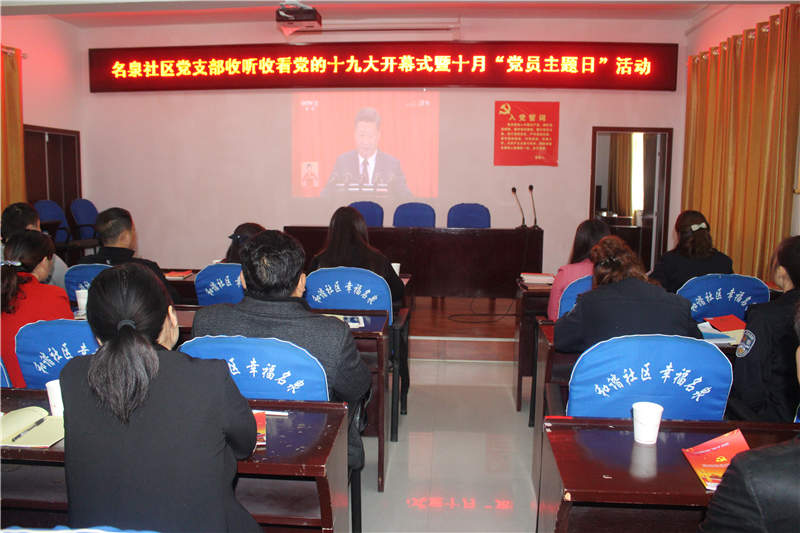 名泉社区党支部组织党员在社区集中收听收看党的十九大开幕会,已有26年党龄的社区党员车孝锦说,过去的五年,是令人振奋的五年,国家发展日新月异,而社区的改变也翻天覆地。希望在下一个五年,我们的祖国更加繁荣昌盛。