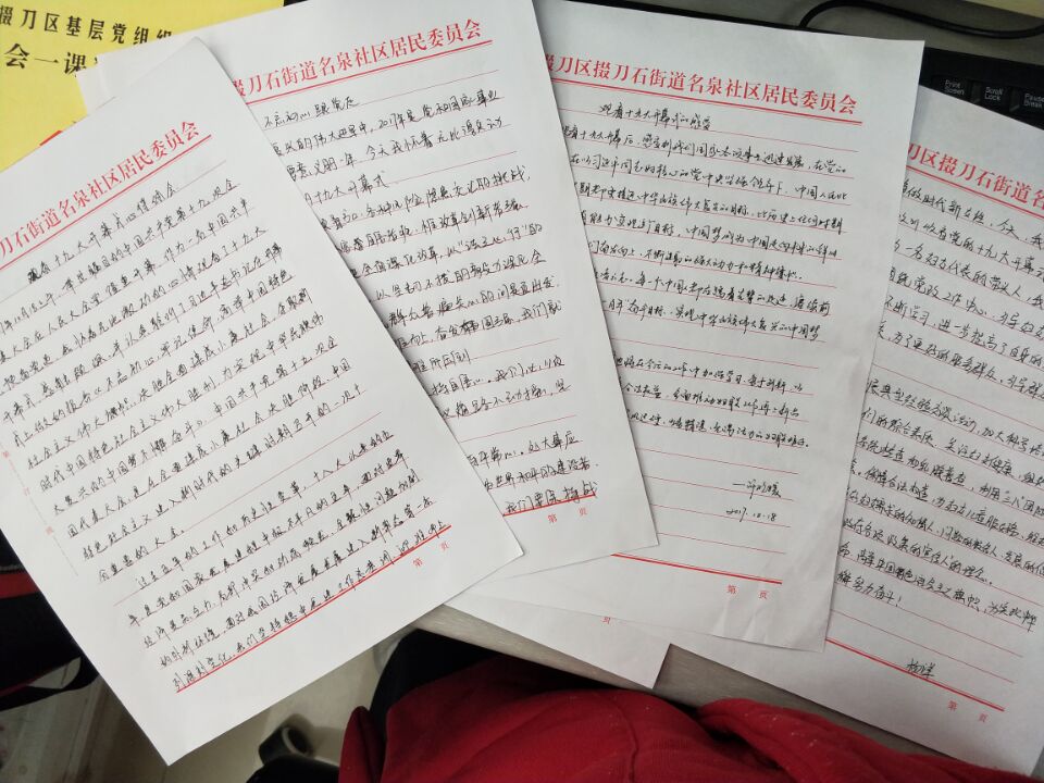 党员在收看十九大开幕式后,热情高涨,自发书写观后心得体会,纷纷表示要以党的十九大报告为动力,在基层岗位上出色完成好各项任务,为建设文明、和谐、幸福的新社区做出贡献。